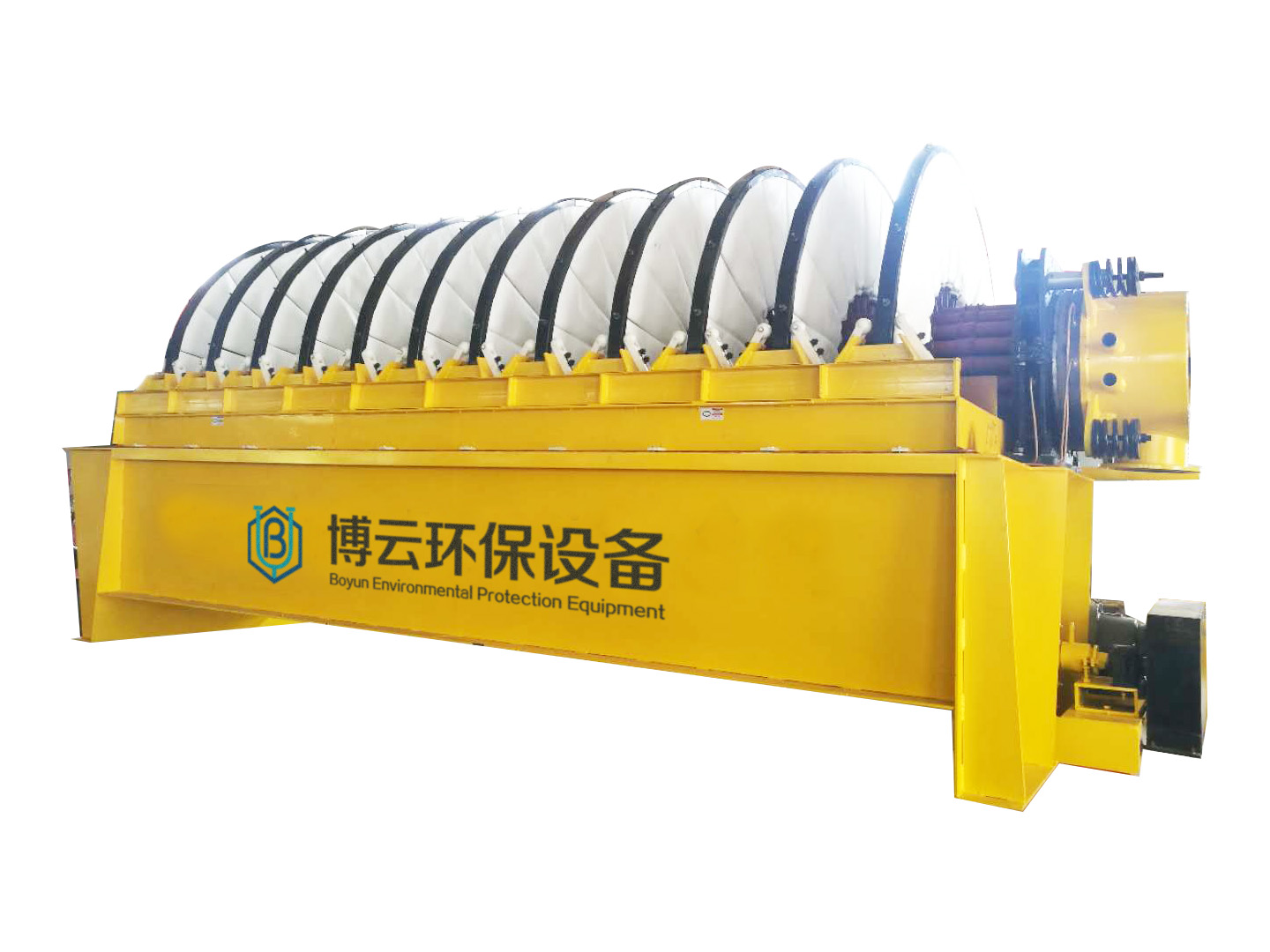 PG系列盤式真空過濾機 (1)扇形濾板脫水孔分布均勻,孔率合理,筋條尺寸大,由高強度工程塑料制成,壽命提高了2-3倍。 (2)濾液管過濾數(shù)面大,分配頭腹腔容積大,提高了抽氣率和濾液排放效果。 (3)耐磨錦綸、單或復絲濾布使脫餅率高且不易堵塞,使用壽命長。 (4)多點干油泵集中多點自動潤滑。 (5)濾布自動清洗裝置,保持了其良好的脫水效果。 (6)臥式強制高速攪拌、軸端采用橡膠及石墨盤根和水壓差三重密封不漏漿。 (7)主傳動無級變速,依物料的濃度及流量調(diào)節(jié)(交流調(diào)速電機或變頻器),以求達到理想的工作效果 。 (8)每盤由20片扇形板組成,加強了過濾過程控制,成餅厚度均勻。 (9)磨擦片采用特制耐磨硼鑄鐵,剛?cè)嵯酀芊饧眩褂脡勖_到十年以上。 (10)濾液管為高強度耐磨陶瓷復合鋼管,提高壽命10倍以上。 (11)濾液管與濾扇接口去掉下法蘭,采取模具定位直接焊接,減少了90%可能的漏氣點。