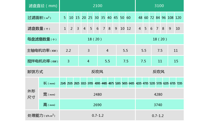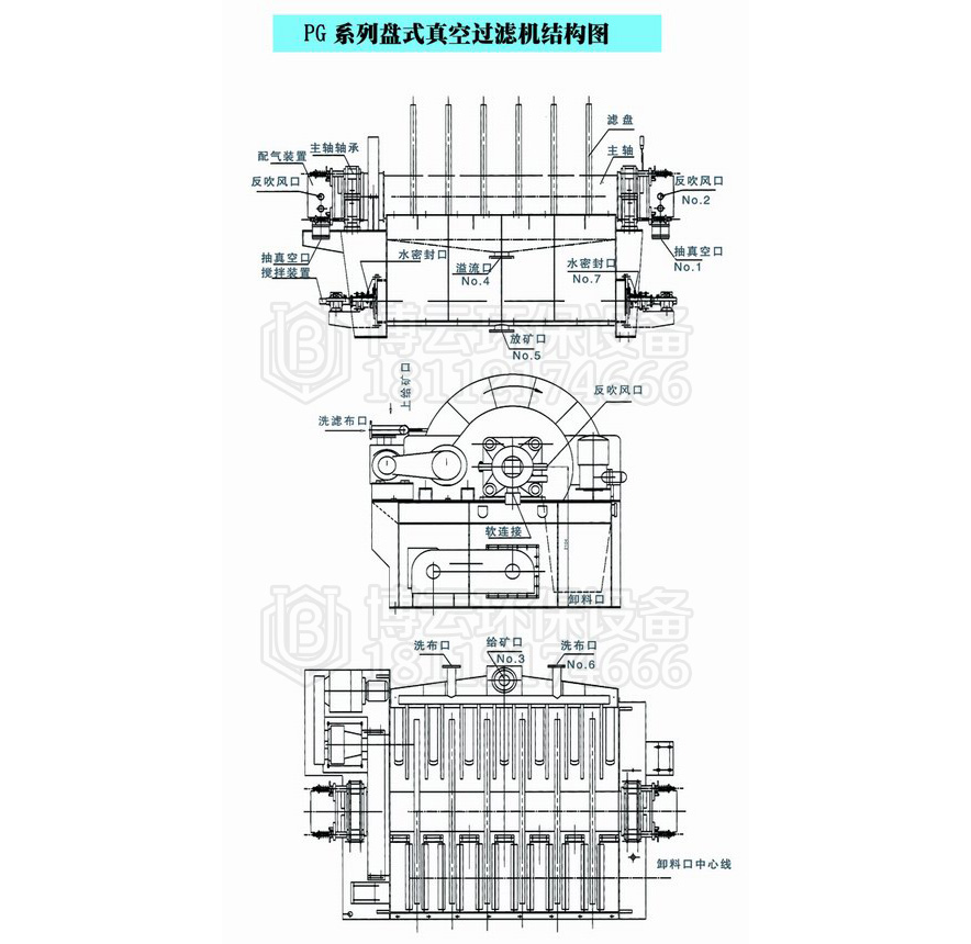 PG系列盤式真空過濾機 (1)扇形濾板脫水孔分布均勻,孔率合理,筋條尺寸大,由高強度工程塑料制成,壽命提高了2-3倍。 (2)濾液管過濾數面大,分配頭腹腔容積大,提高了抽氣率和濾液排放效果。 (3)耐磨錦綸、單或復絲濾布使脫餅率高且不易堵塞,使用壽命長。 (4)多點干油泵集中多點自動潤滑。 (5)濾布自動清洗裝置,保持了其良好的脫水效果。 (6)臥式強制高速攪拌、軸端采用橡膠及石墨盤根和水壓差三重密封不漏漿。 (7)主傳動無級變速,依物料的濃度及流量調節(交流調速電機或變頻器),以求達到理想的工作效果 。 (8)每盤由20片扇形板組成,加強了過濾過程控制,成餅厚度均勻。 (9)磨擦片采用特制耐磨硼鑄鐵,剛柔相濟密封佳,使用壽命達到十年以上。 (10)濾液管為高強度耐磨陶瓷復合鋼管,提高壽命10倍以上。 (11)濾液管與濾扇接口去掉下法蘭,采取模具定位直接焊接,減少了90%可能的漏氣點。